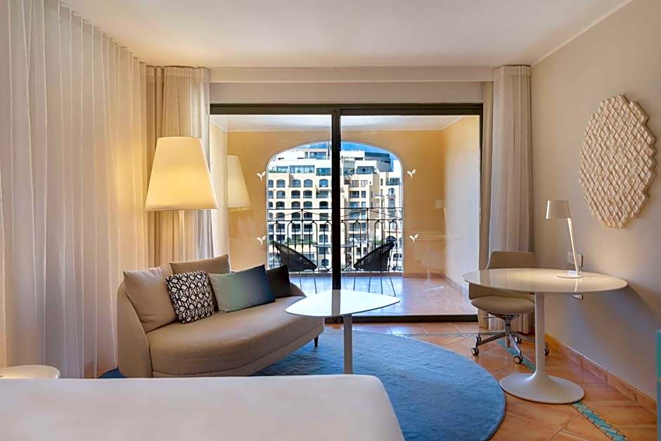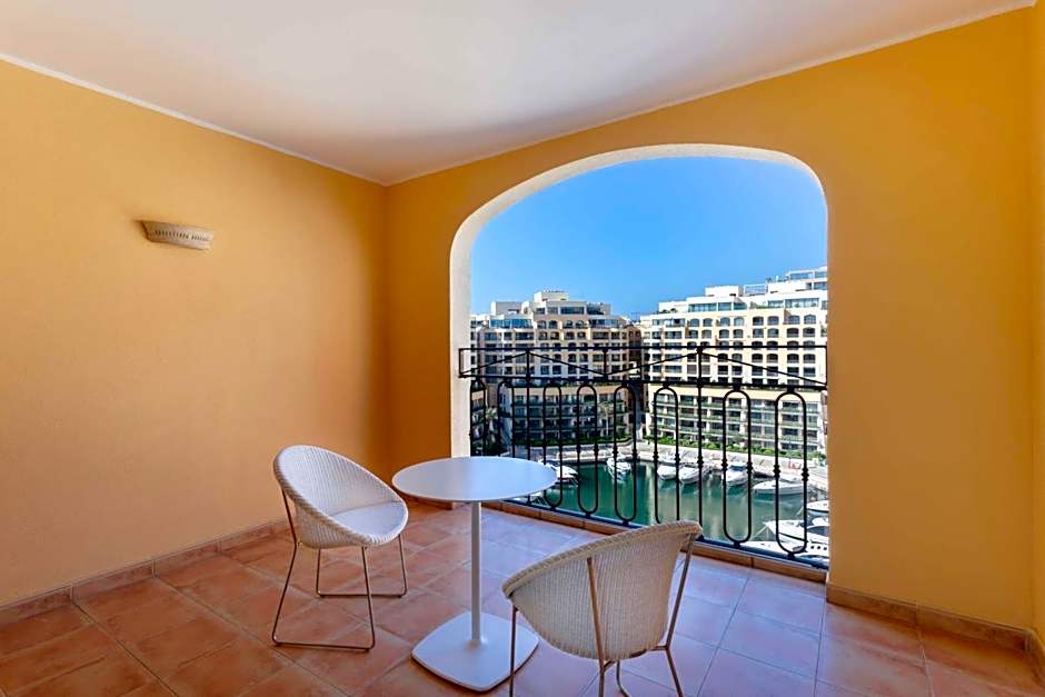 With glass doors that open out onto a spacious balcony or terrace overlooking the Portomaso Yacht Marina. It features Serenity twin beds and air conditioning.